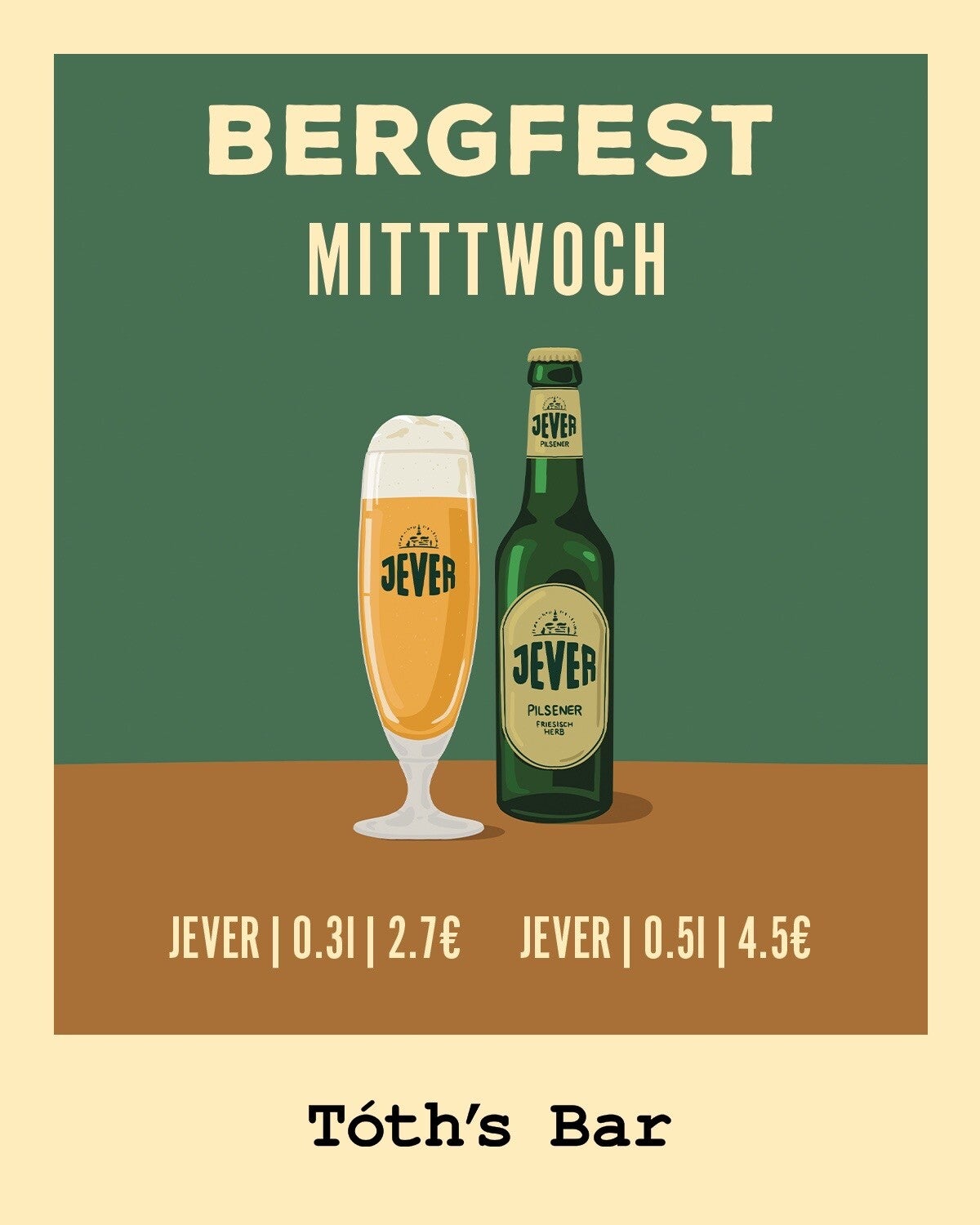 Jever 0,3L/ 2,7€; 0,5L/4,5€